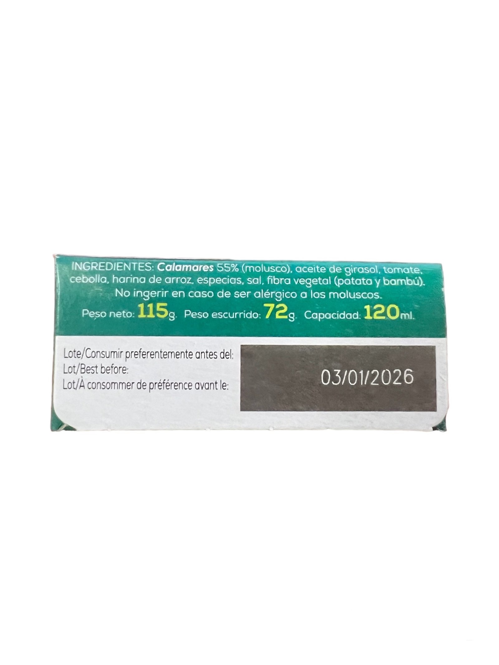 | Ingredientes | Calamares, aceite de girasol, tomate, cebolla, harina de arroz, especias, sal, fibra vegetal. |