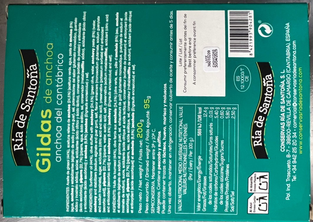 | Ingredientes | Aceite de girasol, aceitunas rellenas de anchoa, piparras, anchoas, sal, ácido cítrico, ácido ascórbico, estabilizantes, azúcar |